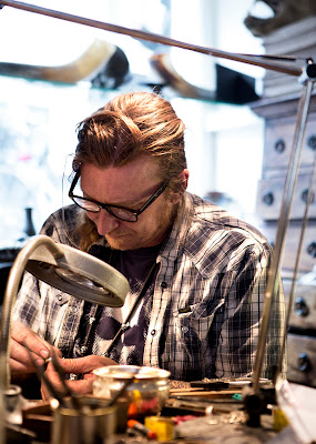 So a couple of months ago, yes I have been summer lazy, I did manage to visit him! What an interesting and super nice guy! We chatted along, I took some photos while he worked on a Mjölnir pendant. A chef from the cafe next door came by with a cup of coffee and him and Erik had a smoke. The atmosphere was filled with originality, coziness and joking around - I really didn't wanna leave..